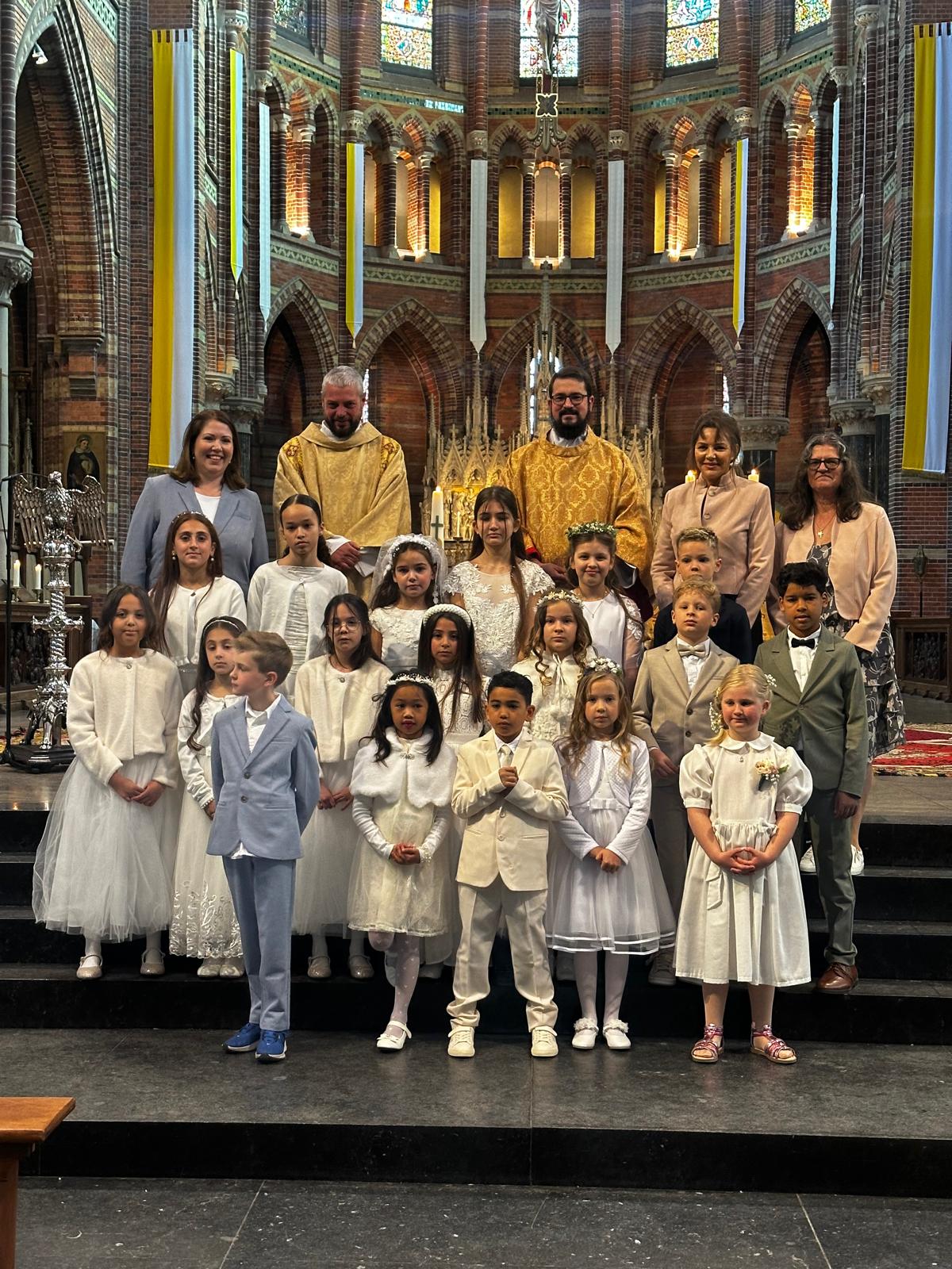 Voor 27 kinderen was het een speciaal weekend! Negen kinderen vierden op zaterdag 18 april hun Eerste H.Communie in de Engelstalige viering met pastoor Dresmé, en op 19 april vierden de overige achttien kinderen hun Eerste H.Communie in de Hoogmis op zondag met kapelaan Juan Andrés Correa del Rio. Alle kinderen waren goed voorbereid en prachtig gekleed voor de gelegenheid. Het kinderkoor zong onder leiding van dirigente Catrien Besamusca.
