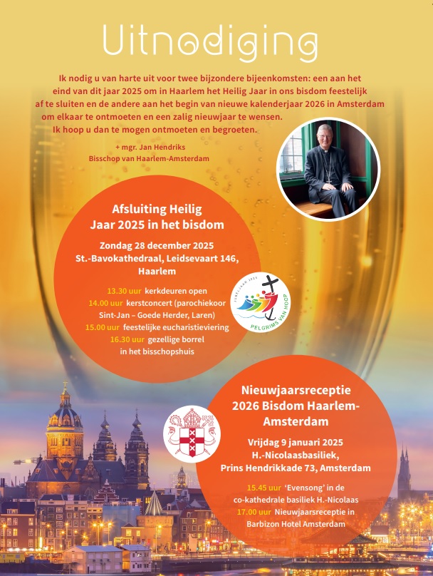 Namens de bisschop wordt u allen uitgenodigd voor twee bijzondere bijeenkomsten in dit Heilig Jaar 2025. Op 28 december wordt het Heilig Jaar afgesloten in de kathedraal van Haarlem. U bent welkom vanaf 13:30 uur. De andere bijeenkomst is de Nieuwjaarsbijeenkomst in de H.Nicolaaskerk in Amsterdam op 9 januari. Daar is vanaf 15:45 uur een Evensong, met aansluitend de Nieuwjaarsreceptie van het bisdom. Hierbij ook de uitnodiging: